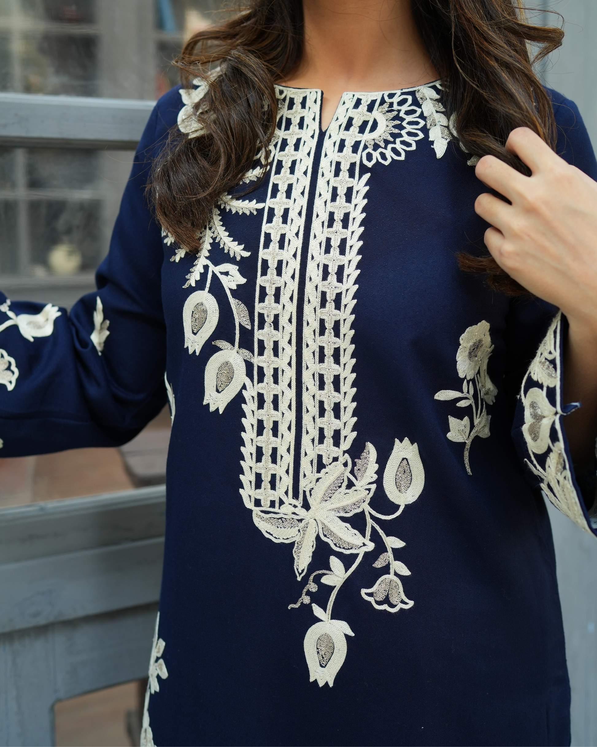 This deep blue two-piece Karandi set is enhanced with embroidery and tila work in floral motifs. The shirt features detailed embroidery and tila on the front, sleeves, and cutwork on border, paired with matching trousers for a complete look. A suitable choice for festive occasions, cultural events, and day-to-evening wear.